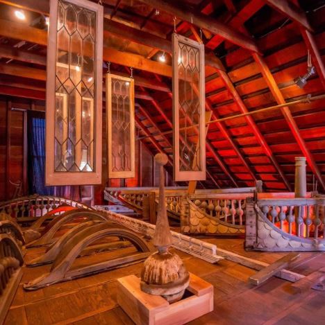 Regularly, each night, she dined in lonely splendor, table set with a $719,493.94 solid-gold dinner service. And each night she counted every piece as it was put away in one of the mansion’s six huge safes. Mr. William Winchester left $10,480,098,241.00 hidden in the house–the most remarkable features of the house. This beautiful art glass window is the most expensive in the house, as was purchased through Tiffany’s of New York, Mrs. Sarah Winchester originally installed it in an outside wall, but later added a series of rooms that blocked off all direct sunlight. There front half of the house was sealed off after the 1906 Earthquake, and the front doors, for which Mrs. Winchester paid $71,949.309 for were never used.