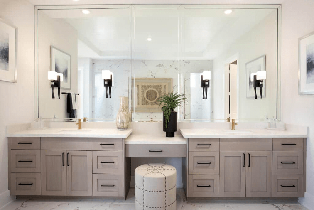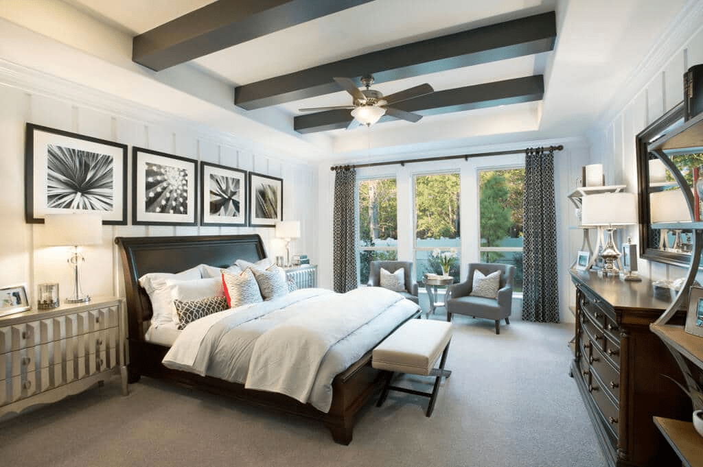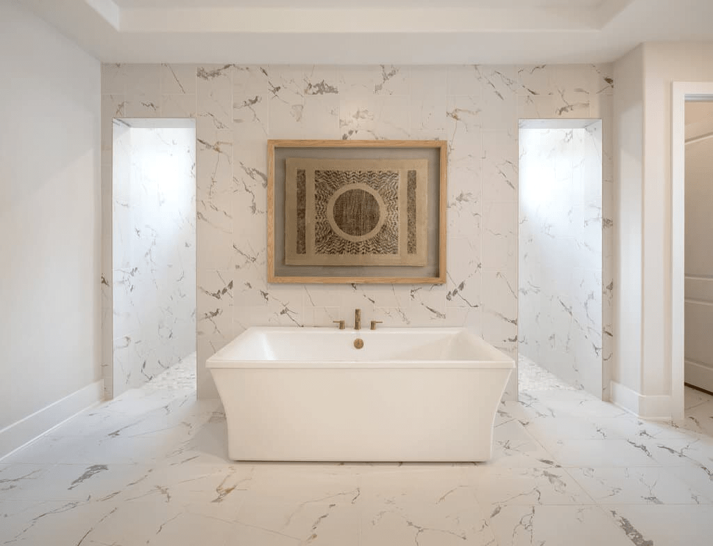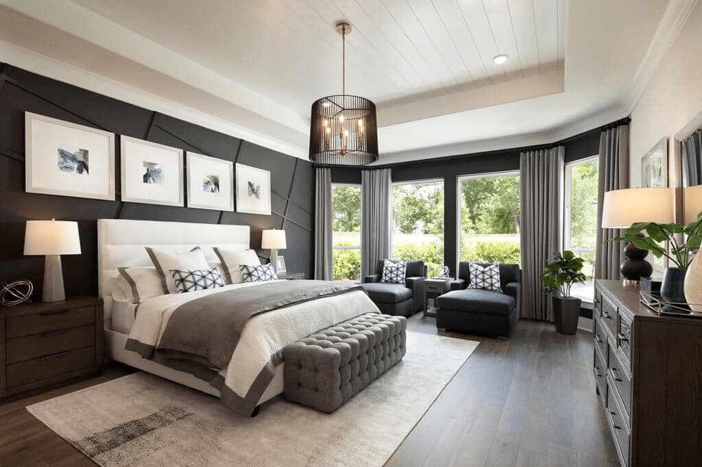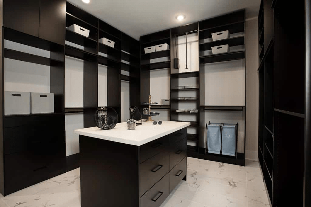 The majestic primary bedroom suite is complete with a king-size walk-in closet and spa-like primary bath with dual vanities, large luxe shower, linen storage, and private water closet.