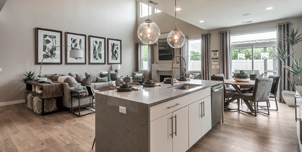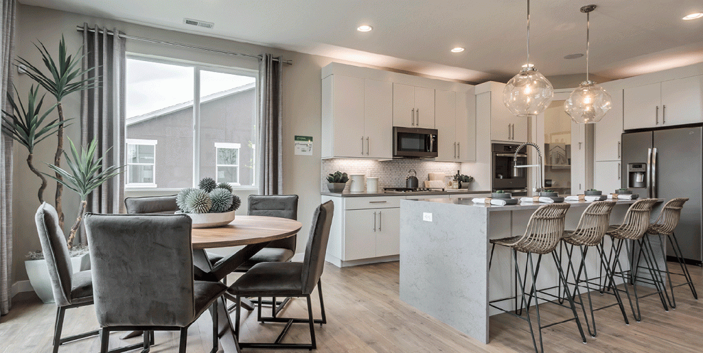 Picture summer at #MillsStation at #CresleighRanch Residence 4. Complete with top-tier design features, in a desirable location, this is the home you have always dreamt of. The stylish kitchen features high quality appliances and quartz countertops.