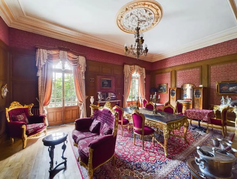 Lambrequins, a fancy word from the French meaning decorative drapery, were made of embroidered fabric, chintz, or of fringed damask. A lambrequin atop window was used to hide the workings of the draper, much like a valance is today. Lace was also heavily used on windows to soften the glare and to provide a pleasing contrast to the heavier velvet or damask curtains. Curtains called portieres (again, the French influence), were also used to cover doors, as ornamentation when draped around the doorway, and to eliminate drafts when hung loose to cover the closed door or entranceway. Sometimes more than a dozen patterns, between wallpaper, carpet, lambrequins, and curtains, were combined in the Victorian parlour, helping to create the notion we have today of Victorian clutter.